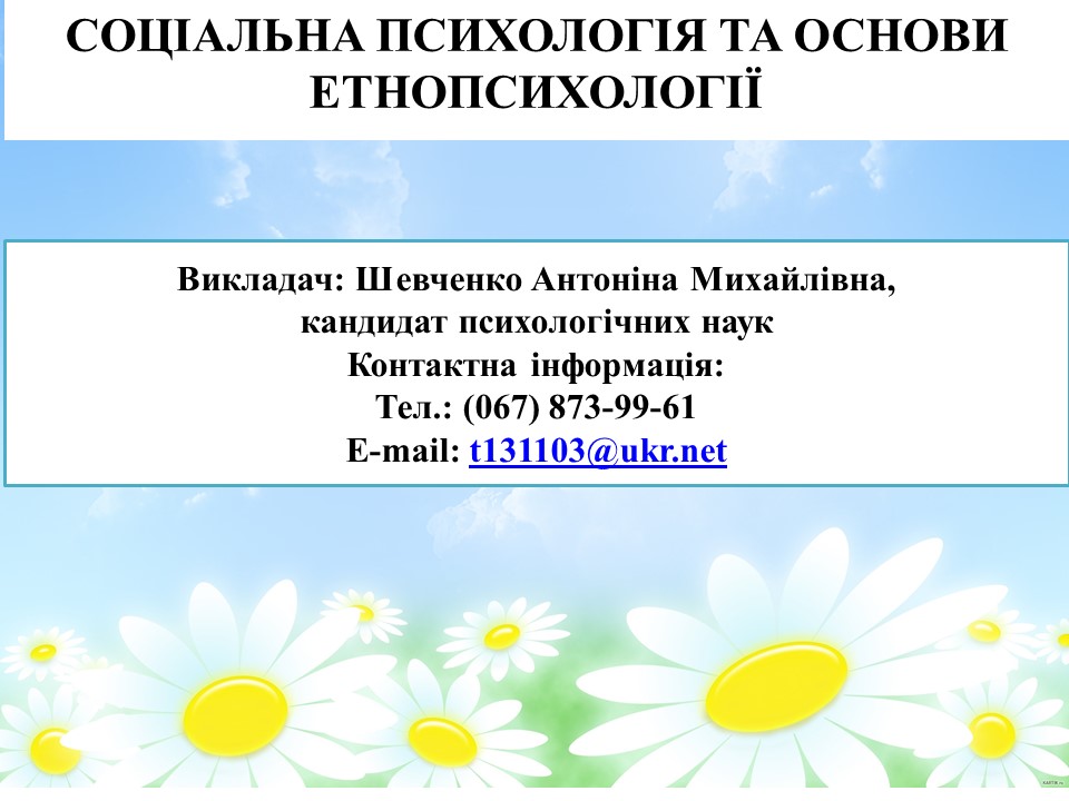 Соціальна психологія та основи етнопсихології – дисципліна, що поєднує вивчення закономірностей взаємодії людей у соціумі та особливостей психіки представників різних етнічних спільнот. Курс охоплює аналіз соціальних процесів, механізмів міжособистісної та групової поведінки, а також дослідження культурних відмінностей, ментальних рис, традицій, вірувань і стереотипів етносів. Набуті знання та навички дозволяють майбутнім фахівцям розуміти соціальну динаміку, ефективно взаємодіяти в багатокультурному середовищі та застосовувати ці компетентності у професійній і науковій діяльності. |